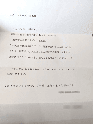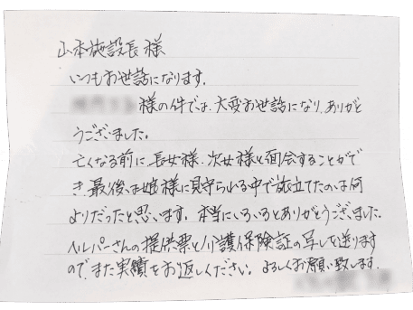 いつもお世話になります。当事業所のご利用者様の件では、大変お世話になり、ありがとうございました。亡くなる前に長女様、次女様と面会することができ、最後は娘様に見守られる中で旅立てたのは何よりだったと思います。本当にいろいろとありがとうざました。