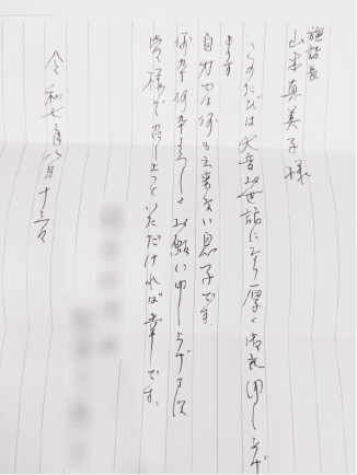 このたびは大変お世話になり厚く御礼申し上げます。自力では何も出来ない息子です。何卒何卒よろしくお願い申し上げます。